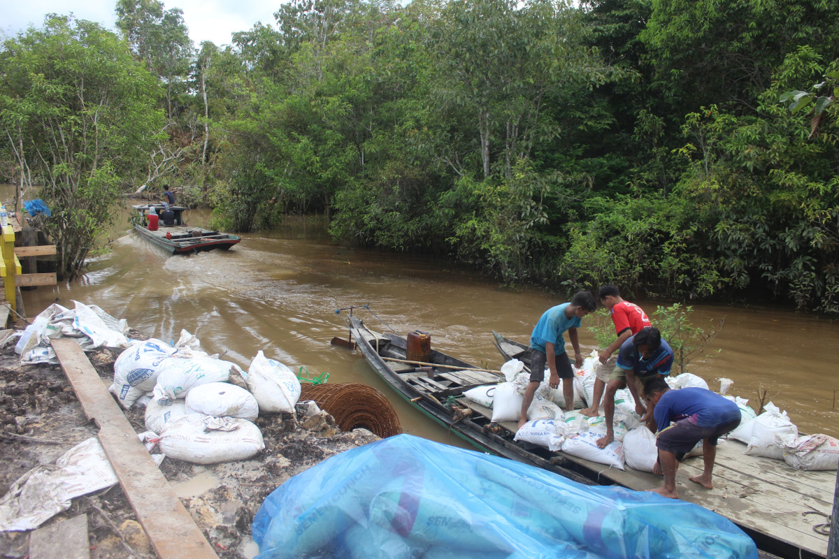 Material seperti semen, pasir, dan batu kerikil diturunkan secara manual dari truk pengangkut. Satgas dan warga membentuk barisan estafet, mengoper karung dan ember satu per satu agar proses bongkar muatan berlangsung cepat dan efisien meskipun tanpa alat berat.