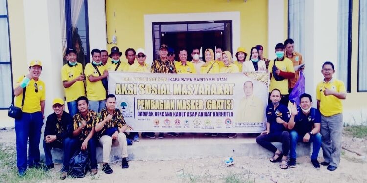 BUNTOK – Kualitas udara di Kabupaten Barito Selatan (Barsel) khususnya Kota Buntok dalam kondisi kurang sehat karena kabut asap, bahkan kian meningkat akibat kebakaran hutan dan lahan (Karhutla) Peduli akan situasi dan kondisi ini, Ketua DPD Partai Golkar Barsel H.Eddy Raya Samsuri,ST,.MM menginstruksikan kepada seluruh unsur pimpinan Golkar Orsa dan Ormas di tubuh Golkar, meliputi MKGR, Kosgoro, Soksi, AMPG, KPPG, Al-Hidayah, AMPI dan lainnya, agar melaksanakan aksi sosial pembagian masker untuk warga.