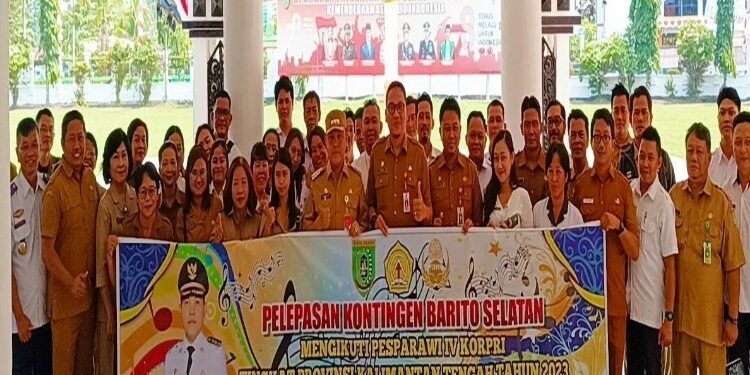 BUNTOK – Pj Bupati Barito Selatan (Barsel) Deddy Winarwan melepas keberangkatan kontingen kabupaten setempat untuk mengikuti Pesta Paduan Suara Gerejawi (Pesparawi) Korpri tingkat provinsi Kalimantan Tengah yang akan berlangsung di Kabupaten Pulang Pisau pada 3-5 September 2023. “Kita mengharapkan kontingen Barsel yang akan mengikuti lomba pada ajang itu bisa mendapatkan hasil terbaik,” katanya, Kamis 31 Agustus 2023. Deddy Winarwan berpesan kepada kontingen Barito Selatan agar menjaga nama baik daerah dan juga menjaga kesehatan selama mengikuti kegiatan ini.
